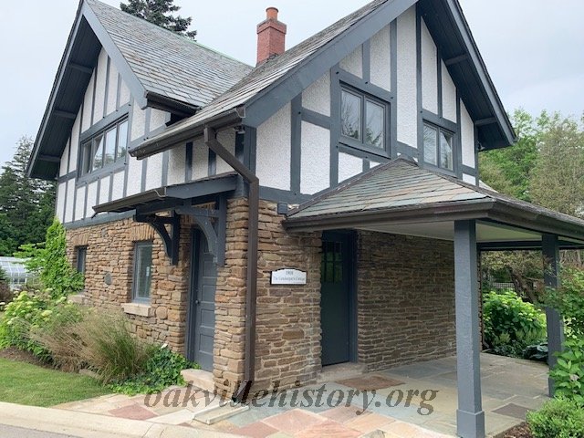 "At the turn of the twentieth century, Oakville gained a reputation as the social centre for wealthy city dwellers from Toronto and Hamilton who flocked to the Town to enjoy the peace and quiet of its lakeside setting." The Report also stated that Ryrie participated in local environmental committees, and this prompted him to purchase the lakeside orchard east of Oakville for his country home which he called Edgemere, "the water's edge ". He enlisted architects Burke & Harwood to design the house (now demolished), the groundskeeper's cottage and the coach house. All of the buildings consisted of flat lake stone on the first storey while the upper storey consisted of solid half-timber construction of local hardwood, morticed and fastened with wooden pins.This style blended with the environment and was an ideal of the Arts & Crafts movement. This style was so popular with a certain class that it earned the nickname "stockbroker’s Tudor".